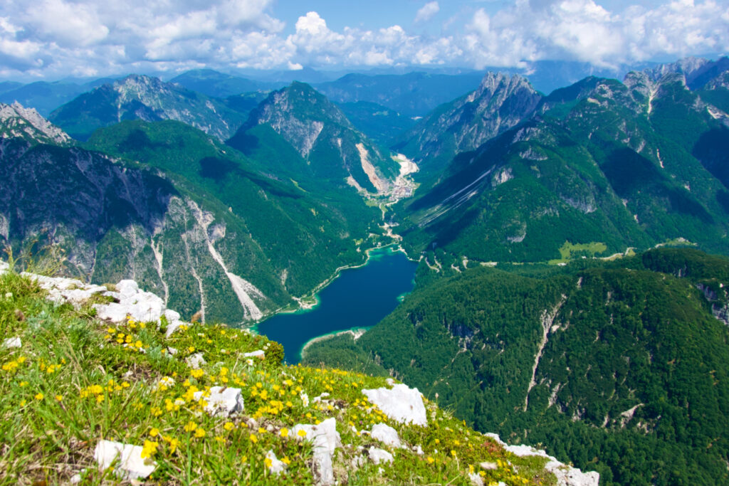 Once at the top, my jaw literally dropped at the sight. The glacial lake glittered a thousand meters below, looking much smaller from a distance, but no less spectacular. Idyllically surrounded by steep green mountains that stretched forever in every direction, both to Slovenia and Italy while also to Austria in the distance, the turquoise-colored Lake of Predil looked so surreal that it was hard to imagine it existed outside of a fairytale. Perfection in its broadest sense.